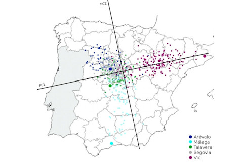There are a few outliers here in relation to their putative population cluster, but in general the three groups are nicely separated as expected. Spain is bounded by water and a rather imposing mountain range. These serve as natural barriers to gene flow. But within the peninsula it's dominated by a high plateau. I really don't have an intuitive understanding of whether the spatial distribution of Spain's people (which for ecological reasons probably can be extrapolated back to antiquity) should homogenize it through a circular pattern of gene flow, but perhaps that's what these data are showing. I am a bit wary of saying that Spain is internally homogeneous without referencing other European populations of the same scale in detail. Perhaps what this group found is what you'd find on this scale with this chip; not much. Cite: BMC Genomics 2010, 11:326doi:10.1186/1471-2164-11-326 H/T Dienekes