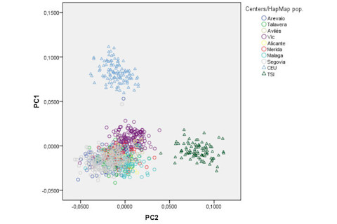 Finally, here are the Spanish samples plotted in relation to two HapMap populations, the CEU (American whites of Northern European ancestry) and TSI (Tuscans from Italy).