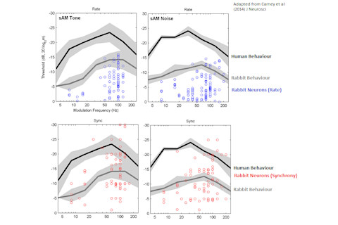 By itself, this might just mean that rabbits’ ears aren’t as good at picking up these stimuli than ours. But Carney et al crucially found that the rabbits’ brain does in fact encode the information needed to perform as well as humans.