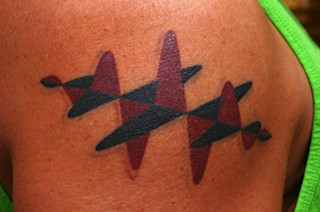 The right shoulder tattoo [CZ: above] is a 3D perspective abstract view of a gaussian photon, a "particle of light," the red vertical undulations represent the electric field, the black horizontal undulations the magnetic field. It is propagating to the right, seen here as a snapshot in time. The photon is the single most common manner in which information is transmitted from one place in the universe to another. The tattoo artist suggested adding the faint shadows to give it depth, but the real reason I agreed was the ironic (oxymoronic?) humor of a particle of light casting a shadow.