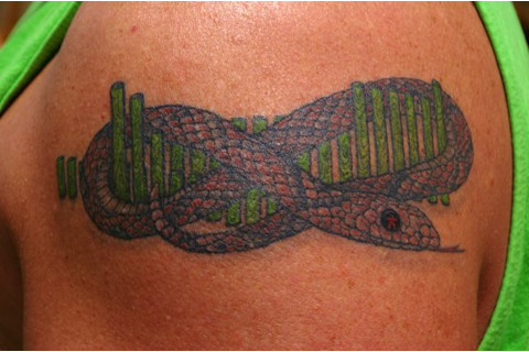 The left shoulder tattoo [CZ: below] is a 3D perspective of the Periodic Table with the Planck Snake weaving around it (note the h-bar, Plank's constant, in the eye). The snake represents the wave nature of matter, and Physics in general. (The infinity symbol the snake forms is a bonus.) The combination of the Periodic Table of Chemistry with the Planck Snake of Physics is also an inside joke at the expense of chemists: It took the Quantum Mechanics of Physics to explain to Chemistry its own Table of Elements.