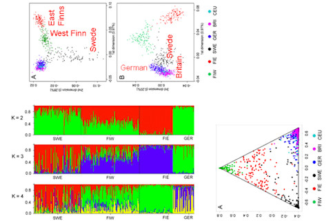 To the left is a frequency map of the concentration of N1c1. Based on the current distribution, and the diversity being modal in the East Baltic, one has to be skeptical of a simple east-west model. Interestingly the frequency difference of this haplogroup between Finland and Sweden is very high. Also, branch of N1c1 seems to be found among the Rurikids of Russia. This was the ruling dynasty of the Rus, a people who originally seem to have been ethnic Scandinavians from Sweden. Eventually they ruled over a polyglot state of Finns, Slavs and Scandinavians, and submerged their own identity with that of the Slavic peasants. In this they followed the example of the Bulgars, who were ethnically distinctive from their Slavic subjects, but were totally absorbed excepting that their ethnonym persisted. There is some evidence that the Serbs are a similar case, an Iranian group which was eventually absorbed into the South Slav substrate. Going back to northern Europe, let's try to get some more perspective. Luke Jostins' personal history is after all a slice of population history, and what we know about the background of the population impacts how Luke views his own personal history. To do that I thought I'd quickly poke around a few older papers on Baltic genetics which I had stashed away. It didn't turn out to be so quick. But here are some figures. First, from Genome-Wide Analysis of Single Nucleotide Polymorphisms Uncovers Population Structure in Northern Europe: