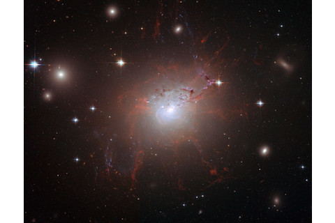 NGC 1275 is a weird galaxy. It's a giant elliptical and sits at the center of the Perseus Cluster of galaxies; a kind of megalopolis of galaxies. It sports a gigantic black hole in its heart that belches out enormous bubbles of gas, which drag tendrils of cooler gas thousands of light years out from its core (yes, black holes can eject material as well as gobble it down).
