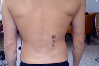 "Otzi was discovered on a glacier in the Austrian-Italian alps by a couple of hikers - his body was well-preserved along with many of his possessions. On his skin there were something like 50 tattoos, I got 10 of the lines on my back in the same place he had his. -- I figure you can spiff up the facts when you actually blog this. Anyway, Otzi was human, 100% human, 100% genetically identical to modern humans today, genetically identical to us, to me. Despite being the same species, we live in a completely different way than he does. My dad worked in an office for 35 years, all my friends work in offices, I was expected to work in an office... so I got this tattoo to remind me that regardless of what our current, blinkofaneye society expects from me, I'm still a human and whatever choice I make is ok. If I want to cross the alps on foot, that doesn't make me any less legitimate than my office-dwelling friends. I got the tattoo to link me to an ancestral human, to pre-industrial revolution (though unfortunately post-agricultural revolution) people. We can never go back, of course, but as Thoreau wrote, 'There are as many ways to live as radii can be drawn from the center of a circle.'"