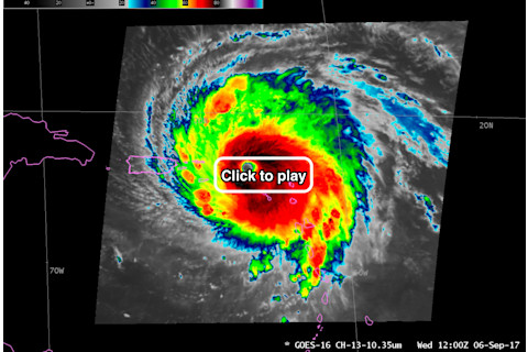 Closeup look at Hurricane Irma's eye, acquired by the GOES-16 weather satellite. (Source: RAMMB/CIRA) As I'm writing this on Wednesday morning, the eye of Hurricane Irma — a “potentially catastrophic” Category 5 storm – has passed over the islands of Barbuda, Saint Barthelemy and Saint Martin, and was shortly headed for the Virgin Islands. I shudder to think what has been happening on the ground with the storm's maximum sustained winds clocked at 185 miles per hour, according to the National Hurricane Center. This video from Saint Martin says it all: https://twitter.com/MeteoExpress/status/905402131481493504 As Irma continues to grind like a buzz saw toward Puerto Rico and eventually Florida, I'll try to post regular updates featuring remote sensing images of the storm. The video at the top of this post is my first installment. It was acquired by GOES-16 as the weather satellite stared into the eye of the monstrous atmospheric vortex. If you watch closely, you can spot swirling shapes within the low-level clouds rotating around the center axis of the eye. Each one is a relatively small vortex itself. Scientists call this a "meso-vortex."