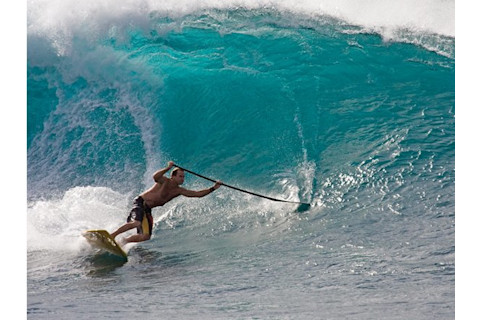 The New York Times has an article about stand-up paddleboarding. I guess that means it's now officially mainstream? It's weird to have seen a sport arise completely from scratch, over a period of just a few years. Five years ago paddleboarders were basically freaks. Now every break is teeming with them, and there's a whole industry specifically for stand-up. Even the gray lady herself is in on the game. For the uninitiated: imagine an oversized longboard (over 10 feet long), with extra width and stability. You stand up on the board, and use a long-handled paddle to propel yourself through the water. Sort of like a canoe, only standing up. It's good exercise. It's also really fun. You can really cruise. And you can enjoy it even if it's totally flat (although the real fun is to take the big boards into the surf). The rapid rise in popularity is almost certainly due to the fact that the learning curve for stand-up paddleboarding is shallow. The average person can be up and going in about 10 minutes. And it's almost like they're surfing. After all, they're standing on a surfboard, moving through the water. However, this is a pale imitation. Until you actually get the board out in the surf, and feel the acceleration of a drop, and the exhilaration as you glide down a wall of water, you have no idea what it's all about. Good paddleboarders can go out in big surf. But that part of the learning curve is Jaws steep. I was in Maui this past January, and my favorite break (Kanaha) was overrun by paddleboards. At least half the people out there were doing stand-up. For a "conventional" surfer it's a bummer, since the paddleboards catch waves early, and there's no room to drop in, even if you wanted to. But if you can't beat 'em…. About a year ago I had my initiation, doing a down-winder from past Ho'okipa to Spreckelsville. It took a while to get the balance down, but eventually you figure out where to stand, and how to use the paddle for stability. And then you're cruising. You can paddle into reasonable breaking surf, since the board has a tendency to keep going and remain unperturbed. You cut right through waves that would have tossed a longboard. However, I can tell you from painful experience that it really sucks to get Maytagged while doing stand-up. I have a nice fin-shaped scar to prove it.