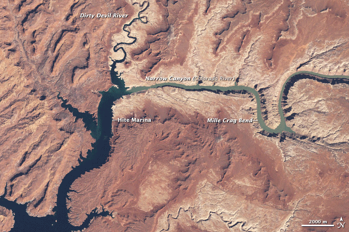 Las Vegas, to the left, and Lake Mead, to the right, as seen on July 21, 2014 by the Landsat 8 satellite. Lake Mead reached a record low water level that month. (Source: NASA Earth Observatory) The problem, in a nutshell, is this: The Colorado's flow once dazzled, like Old Faithful in Yellowstone. But today the geyser has become enfeebled. Here are the sobering details from a report by the Bureau of Reclamation: