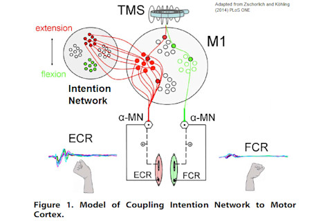The authors hypothesize that the brain's 'intention network' prepares desired actions by increasing the excitability of the cells in the motor cortex that can produce the movement intended. On this view, a weak TMS pulse provides just enough extra activation to trigger those pre-excited cells into firing, while being too weak to activate cells that govern other movements.