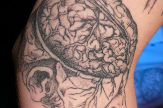 Kristin writes, "This is a rendition of Andreas Vesalius' 'The Quivering Brain.' I admired many of his anatomy studies in art school, as I spent fifteen years as a painter, but I was always a little more interested in science than art. I even considered a career as a medical illustrator at one point. Using science as artistic reference and researching for a painting was my favorite part of painting. Actually, it was the only thing I really enjoyed. It took me many years to realize this. I got this tattoo right before going back to school to study neuroscience. It couldn't be more perfect." Click here to go to the full Science Tattoo Emporium.