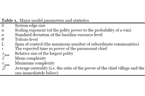 The first issue has an article by Sergey Gavrilets, David G. Anderson, and Peter Turchin. Gavrilets is a familiar face. I know him from his work in evolutionary theory. The paper itself is a readable and plausible model of how "medium scale" societies rise and fall through conflict and consolidation. Basically the stage of human society described in Laurence Keely's seminal War Before Civilization; after agriculture, but before major literate state systems. Their basic method is to take a mathematical model with a tractable number of plausible parameters and run simulations which give one a sense of how it changes dependent variables of interest. Polities were modeled as being circumscribed hexagons; so they had six neighbors (instead of four which would be the case if they were squares). The area modeled had an "edge," and polities can exist in a flat hierarchical structure, or eventually aggregate so they exhibit rank order. Additionally, polities varied by economic productivity. Finally, there was a temporal aspect in that there was a potential conflict per generation where the probability of success was conditional upon the strength of the polity. Being more powerful increase the probability of victory, but does not guarantee it. Flukes do happen. The full model can be found in the paper, which is open access. The math isn't totally opaque, so I'm really not going to distill it down. You can swallow it whole. Rather, let's look at the list of parameters and statistics: