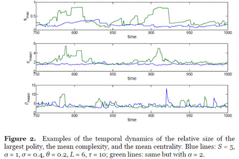 Most of the above variables are pretty straightforward. You should know that "complexity" refers to the levels of structure above the independent village. Presumably larger polities will have more complex structures, because they have to. Here's a figure which shows the dependency of the statistics over time on α, the scaling exponent. α = 2 a quadratic, while α = 1 linear. The area of a square grows as a quadratic function. In other words, there are greater gains to to the variable than a linear increase.