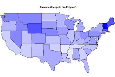 Here you can see that Vermont, New Hamphsire and Delaware show both large absolute and relative changes in those with No Religion. By contrast, North Dakota shows a large relative change, but a modest absolute change. That's because North Dakota started at a very high level of confessionalization, so any shift would show as a large relative change. Oregon, California and Arizona are on the bottom left of the chart because these were already rather secular states, so the relative and absolute changes are not particularly great (they're below the trendline in the first scatterplot). Here are some maps which show the geographic clustering....