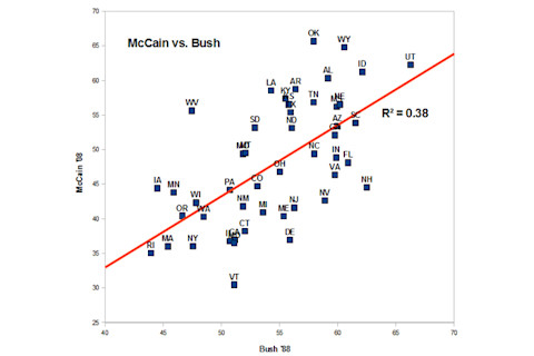 Now I want to see how (non)religious change tracked political change. I am going to look at the % vote for Republican presidential candidates in 1988 and 2008, and compare them to ARIS 1990 and 2008. First, how do the 1988 and 2008 presidential elections compare?