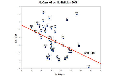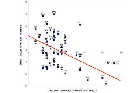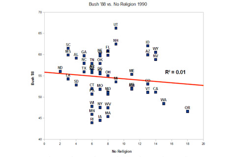 I was a little surprised at the low R-squared here; but realignment has progressed it seems. Now let's compare the percentage with No Religion and voting for the Republican in respective years.
