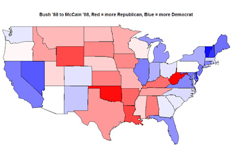 Barry Kosmin at CUNY has published the results of three surveys of American religion since 1990. These "American Religious Identification Surveys" (ARIS) were done in 1990, another in 2001, and finally in 2008. One of the major findings of the ARIS has been the rise of those who avow "No Religion". Looking through the data it is also clear that aggregating nationally understates some of the local changes. In 1990 47% Vermonters were non-Catholic Christians (i.e., Protestants). In 2008 29% were. In 1990 13% of Vermonters had No Religion. In 2008 34% of Vermonters had No Religion! In fact, No Religion has a plural majority in Vermont, with 26% of the population being Catholic. This is a much bigger shift than nationally. In Kosmin's book One Nation Under God, which drew upon the 1990 survey results, he noted that though the Northeast has a reputation for being relatively secular, it is in fact highly confessionalized in comparison to other regions, such as the Pacific Northwest. This isn't true anymore; much of New England has experienced a wave of rapid secularization and disaffiliation. If current rates of secularization continue Vermont may become the first minority non-Christian state. It was only 55% Christian in 2008. I am going to explore these data with scatterplots and maps. All the plots have 1990 data on the X-axis and 2008 data on the Y-axis. I also look at the 1988 vs. 2008 presidential race, and attempt to see if there is any connection between secularization and political change. Here's a scatterplot showing % with No Religion in 1990 & 2008 by state: