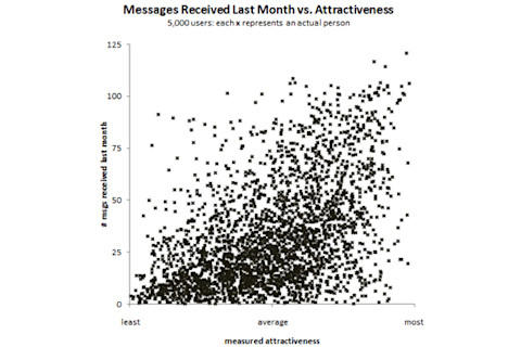 Let's start at the beginning. To the left you see a scatter plot of # of messages received by women per month as a function of their rated attractiveness. They controlled for background variables (e.g., race). On the one hand, the results aren't surprising. You see that more attractive women receive more messages. But on the other hand, the residual (noise) around the trend line is enormous, especially in the top half the distribution. I am personally rather surprised at the enormous variance of message # at the higher ratings. But here's an important point:
