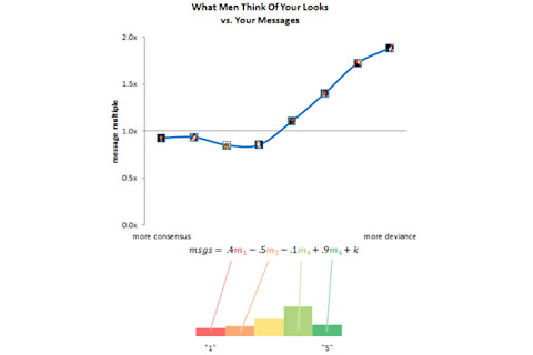 The authors of the OKCupid post implicitly give a nod to this, illustrating the peculiar pattern of variation in message responses. Their data set indicates that a woman who received more extreme reactions would receive more messages than a woman who received more uniform reactions, even if the latter had a higher average rating than the former. This is certainly counterintuitive. What's going on here? First, let's present the OKCupid explanation: