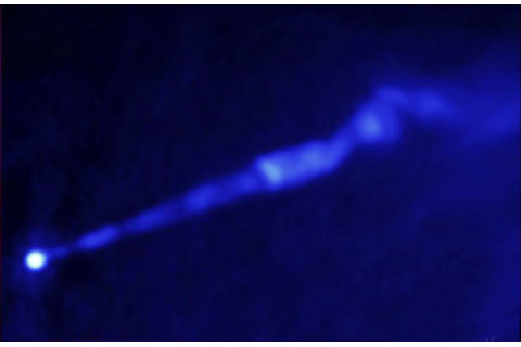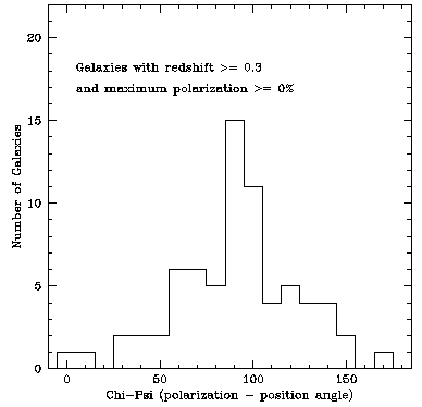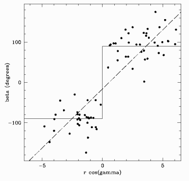 As it turns out, Nodland and Ralston had simply made a mistake. What they, and before them we, were doing was comparing the polarization from distant quasars to their orientation angles on the sky. Many of these quasars have extended jets coming from massive black holes at their centers, and the orientation of these jets defines (more or less) an orientation on the sky, as in the image of M87 above from the Very Large Array. We expect that there will be magnetic fields that stretch along the jet, and that free electrons will be spinning in circles perpendicular to the magnetic fields. These electrons then emit synchrotron radiation -- the motion of the electrons produces a time-dependent electric field, which travels to us as radio waves. Because that motion is perpendicular to the background magnetic field (and thus to the jet), the electric field in the resulting radio waves is likewise perpendicular to the jet, and its that electric field that defines the polarization. In other words, on physical grounds we anticipate that the quasar polarization is at roughly 90 degrees to the angle of the jet on the sky. We were looking for any systematic deviations from this relationship, either in the same sense everywhere (George, Roman and I) or clockwise in one direction and counterclockwise in the other (Nodland and Ralston). You'll notice, though, that neither the polarization angle nor the orientation angle of the jet is uniquely defined; rotating by 180 degrees gives you an equally good answer. So the difference between them is likewise subject to a 180-degree ambiguity. Since you expect the difference to be 90 degrees, this doesn't make much of a difference in practice; indeed, if you resolve the ambiguity by defining the difference to lie between 0 and 180 degrees, there is an obvious peak at 90.