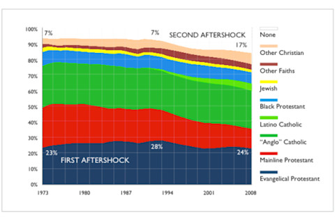 The book American Grace: How Religion Divides and Unites Us has been getting a lot of press, as it should. It's pretty rich in data, and finally puts a spotlight on one of the most underreported trends between 1990-2010, the massive surge in irreligion. Because of the power of the Religious Right many Americans perceive that this is a nation in religious revival. And it is. But only among a subset of the population. A more numerous segment has been disaffiliating, silently, but consistently. The data's been around for ten years now, though pop culture hasn't caught up. Probably the biggest surprise in American Grace are results which imply that people tend align their religious views with their politics, not the other way around. This shouldn't be a surprise, but it is, and that's because many people hold that the best predictor of religious views are conscious and reflective. The reality is that implicit social cues and pressures are probably more important. You align yourself with your milieu, as much as you select your milieu to align with your own views and attitudes. If you aren't inclined to read the book, Pew released many of the top line findings online over the weekend. Some of the graphics are pretty cool. Here are religious trends over the last generation: