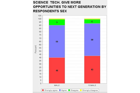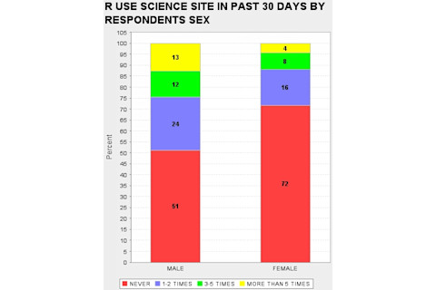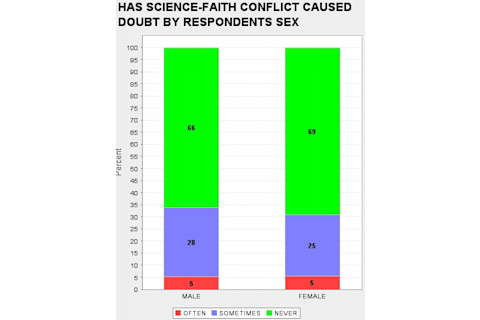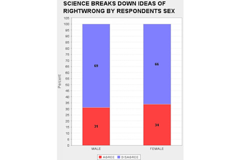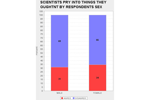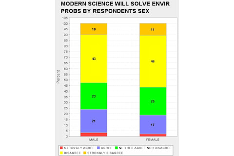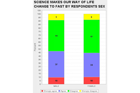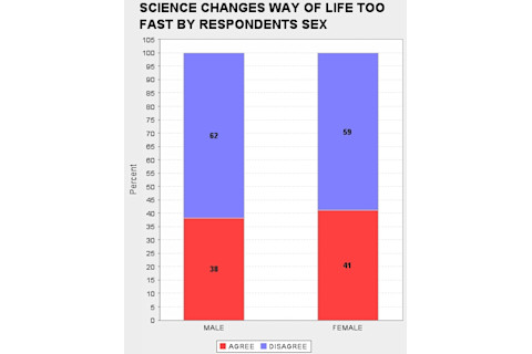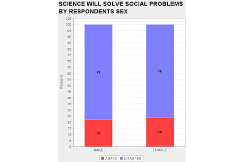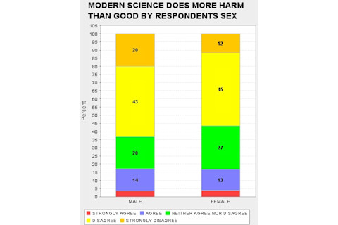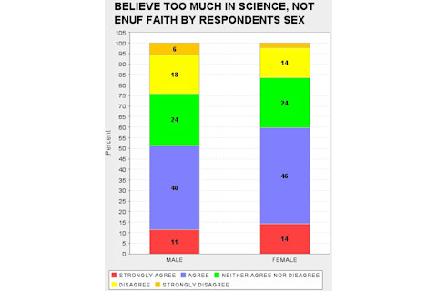 When I look through the GSS I am struck, and sometimes disturbed, by the way attitudes toward science track various demographic slices. It is no surprise that Fundamentalist Christians tend to be suspicious of science, but blacks and the poor also tend to be much more hostile than whites and the middle and upper classes. So I was curious as to whether there was a systematic sex difference as there are on some issues (astrology) but not on others (abortion). What differences there are seem very modest. In fact, I am struck that the difference in daily familiarity with science does not result in proportionally a greater unease with science on the part of the sex which is less familiar on average on a day to day basis with science (females). If you want to replicate what I did below, the "ROW" variables are: DOUBTS3 SCI30 TRUSTSCI SCISOLVE SCICHNG SCIMORAL NEXTGEN TOOFAST SCIFAITH HARMGOOD SCIGRN SCIPRY (you can just cut & paste this list). And the "COLUMN" was obviously SEX.