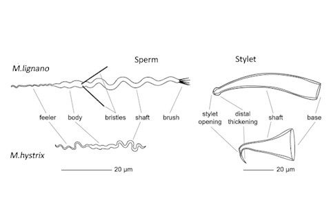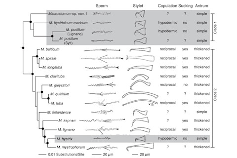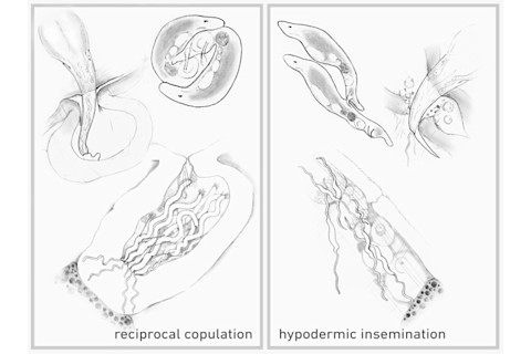 [embed width="610"]http://www.youtube.com/watch?v=HblzwiZIgfg[/embed] Lukas Schärer from the University of Basel has found that these traits go hand-in-hand. He found that 16 species of flatworm, all within the genus Macrostomum, fall into two distinct groups. In the first group, represented by M.lignano, individuals mate in a ring, try to suck out sperm after sex, and have large, bristly sperm. The second group, represented by M.hystrix, practice traumatic insemination, have small, simple sperm, and never try to suck it out. Among these worms, the shape of the genitals and sperm, and the way they mate have all evolved together in predictable ways. In the flatworms, Schärer sees a classic example of how the competing interests of males and females can drive the evolution of their bodies and behaviours. We’re used to seeing this conflict at the most obvious level, where males and females choose who to mate with. But even after sex, the battle continues, especially if females mate with many males. The sperm from different males compete with one another for fertilisation rights. Meanwhile, females can exert their own control by selectively removing the sperm of unwanted partners. Females evolve resistance, males evolve persistence. These pressures apply across the animal kingdom, even in species like the flatworms, where individuals are both male and female. The female end has evolved a behaviour – sperm-sucking – that gives it control over who eventually fertilises its eggs. The male end has evolved sperm that are difficult to remove. The result of this fierce evolutionary battle is a perpetual stalemate, but some species have broken free by switching tactics. By entering traumatically through the skin, rather than through the genitals, the “male” can bypass the “female’s” resistance altogether. But their sperm now face new challenges – most of all, they need to move around easily. The bristles that so effectively anchored them inside a female’s genitals are now a hindrance, and they’re soon lost. If different “males” inject into the same female, their sperm compete for fertilisation rights within her body. Numbers and agility give them the edge, so the sperm become smaller and more numerous. As the sperm evolve, so do the worms’ genitals. The stylet adapts to more easily pierce a partner’s skin, becoming sharper and reinforced. The female antrum also changes. In the ring-mating species, its walls are thick to prevent injury from the intruding stylet or the anchored sperm. In the traumatic species, the antrum plays no part in sex, and its walls become thin and simple. One flatworm – M.finlandense – is probably halfway along this change. We don’t know much about its sex life, but its body provide a clue. Like M.lignano, its sperm still has bristles, but they are short. Like M.hystrix, its stylet is pointed and rigid, but it doesn’t have the thickened edge that all other traumatic inseminators have. In fact, Schärer found that the flatworms have made this switch at least twice, independently ending up with the same sperm, genitals and behaviours. He sequenced genes from his 16 species to find out how they are related to one another. His family tree clearly showed that the traumatic group are more closely related to each other than to the ring species. The only exception is M.hystrix, a lone traumatic inseminator within a group of ring-maters. It evolved the traumatic lifestyle on its own. But why study flatworms at all? The answer is simple – they are transparent. It can be very difficult to study sexual conflict because, for obvious reasons, it’s not easy to see what happens to sperm inside the female’s body. Scientists have to come up with ingenious solutions, like genetically engineering animals with glowing sperm. But that’s not a problem if you can see straight through your animals of choice. To Schärer, the flatworms provide a literal “window of opportunity” for understanding the evolution of sperm, the most diverse group of cells in the animal kingdom.