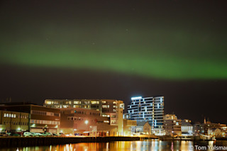 The aurora borealis over the city of Tromsø in the Norwegian Arctic on Jan. 18, 2014. Tromsø, site the of Arctic Frontiers conference, is a thriving, prosperous city that has positioned itself as the self-described gateway to the Arctic — and its suspected vast resources of oil, natural gas, and other resources. (Photo: © Tom Yulsman) If I had to come up with one word to describe the gestalt of my first winter visit to Tromsø, Norway, it would be “paradox.” I’m now here for my third winter trip, to attend the Arctic Frontiers conference, where the theme is “climate and energy.” I suspect the same word will apply — but this time for a different reason. Many things have changed since my first visit in 2013, including the price of oil, the recognition of how difficult it is to develop resources in the Arctic, and, possibly, public attitudes. “Paradox” fit very well back then. When I left my home near Boulder, Colorado that year, winter had brought cold and snow. I was anticipating even colder conditions in Tromsø. But when my flight touched down I was surprised to find that it was warmer above the Arctic Circle than at home — and that I needed an umbrella.