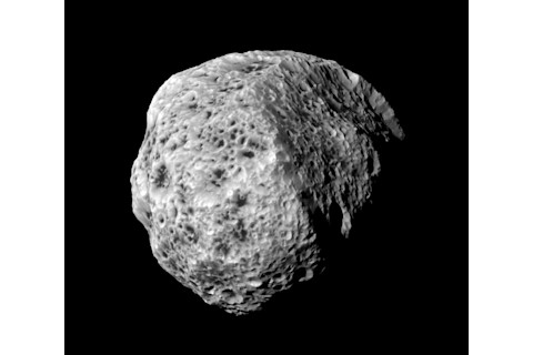 [Click to entitanate.] Just looking at it, you get a sense of strangeness, don't you? It's little, only about 270 km (170 miles), but packed into that tiny moon is a Universe of weird. It looks like a sponge! Or more like a piece of packing foam that's been pinged by a BB gun. It has a very low density -- about half that of liquid water, even less dense than water ice, indicating it must not be entirely solid. It's porous, like a sponge, or a pile of rubble. And those craters... they just look funny. They have sharp rims, shallow slopes, and flat bottoms, and it's thought that this is because of how crunchy Hyperion is. Instead of blasting out material like on rocky moons, impacts compress the surface, like punching a block of Styrofoam. The bottoms of many of the craters are dark, filled with hydrocarbons that form when sunlight changes the structure of simpler molecules. That giant flat region on the right is actually a huge impact crater -- you can see the central peak in the middle, typical for big impacts -- and it reminds me strongly of the huge south polar impact basin on the asteroid Vesta, which itself is a weird place. But it can't hold a candle to Hyperion. I've talked about Hyperion before (see the Related Posts links below) but I can't get enough of just how freaky this moon is. While it bears some resemblance to other objects in the solar system, it has a bizarre nature all its own. Perhaps I'm showing my American fondness for underdogs, but Hyperion really is one my favorite worlds in all the solar system. We may never understand everything about it, but with every pass by Cassini, we learn a little bit more, and that's cool enough for me.