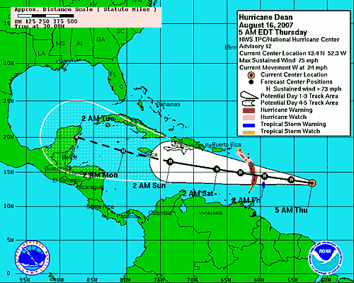 The tropics sure are giving me a lot to write about. My latest "Storm Pundit" post, entitled "Nothing But Land to Stop Hurricane Dean...and Supertyphoon Sepat," is now up. Both of these storms are scary, and Dean, now officially a Category 1 hurricane, is predicted to be as strong as Category 4 by the end of the forecast period. Here's the latest track, which is basically unchanged except that the Lesser Antilles are now under a hurricane warning: