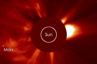 If you haven't done it already, click on the image above for an animation of images sent back to Earth by the Solar Heliospheric Observatory showing the CME exploding from the sun's surface and racing out into space. Mars is visible in the image. I'm a little unclear whether the animation actually shows the particles reaching all the way to the Red Planet. NASA's news item on the event didn't say. (Mars could behind the sun, giving the impression that it was blasted by the solar eruption when it might not have been.) Evidently, the eruption of particles did reach us. From NASA: