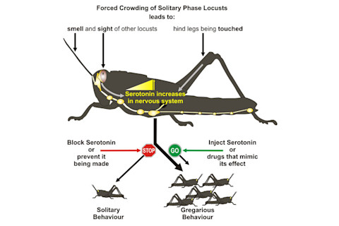 It's effectively a form of memory; the animals interact with one another and change their long-term behaviour accordingly. Serotonin performs similar roles throughout the animal kingdom, so perhaps its part in locust behaviour shouldn't be too surprising. The exciting bit though, is that there are only thirty neurons in a locust's nervous system that can produce serotonin. So it's entirely possible that Simpson's group will eventually discover the individual nerves responsible for the switch from solitude to swarming.