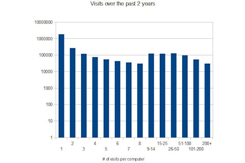 When I first started blogging in 2002 the aim, as much as there was one, was to cultivate a particular following. But almost immediately Randall Parker noticed that traffic to his weblogs were driven not just by conventional blog readers who became "regulars," but also transient search traffic. This is particularly common in the case of time insensitive posts. Basically there are two classes of "readers," the "one off" sort coming in through search engines, and "regular readers," of whom commenters are the tip of the iceberg. Here are classes of number of visits per visitor over the last two years at this weblog. I've log transformed the results. Notice the bimodality. If you care, currently it looks like the regular repeated visitors, as defined by showing up at least more than once a week, number on the order of 20,000-30,000.