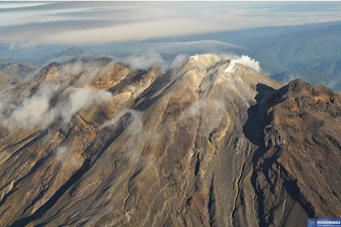 A webcam capture of the June 30, 2012 eruption of Nevado del Ruiz in Colombia. Most of the volcano is obscured by clouds, but the grey-brown ash plume spread ash across the countryside. Image courtesy of INGEOMINAS. Nevado del Ruiz After an almost 2o year slumber, Nevado del Ruiz has sprung back to life this year, with multiple small, ashy explosions (see above) and constant seismicity that might be leading to more vigorous eruptions (or might not). A few thousand people have needed to evacuate the slopes of the snow-covered volcanoes, mostly due to the threat of lahars generated by these explosions and rapid melting of snow and ice at the summit. Ash continues to fall on areas around the volcano as the activity waxes and wanes as well. The latest update from INGEOMINAS on the activity at Ruiz has the volcano at Orange Level II status, meaning eruptions should be expected in days to weeks. MachínMachín, a neighbor of Ruiz, has also seen elevated levels of seismicity over the past few years. Nothing has occurred beyond earthquakes that suggest rock fracturing that could be hydrothermal or magma movement under the volcano. Machín hasn't erupted in over 1100 years and not much is known about the dome complex that sits within a 3-km caldera. INGEOMINAS currently has the volcano at Yellow Alert III due to the continued seismicity. Huila After over 450 years of quiet, Nevado del Huila came back to life in 2008 with a series of small explosions that has produced ash falls, lahars and lava domes at the summit of the volcano (totally a VEI 3 eruption so far). The eruption is considered to be ongoing, although right now the volcano is merely steaming from fumaroles at the summit and experienced tens to hundreds of small earthquakes each week. Huila currently sits at Yellow Alert III.