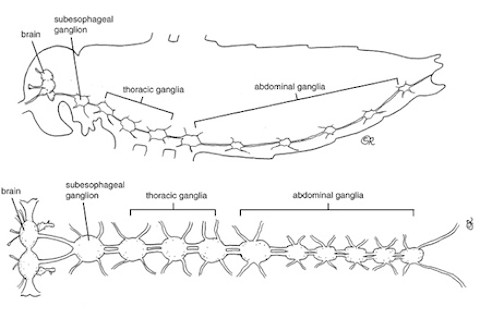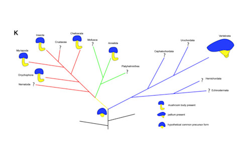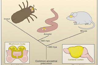 Vertebrates are not the only animals with a nervous system, however. Insects, crustaceans, worms, and other invertebrates have nervous systems that are also organized around a central cord. These invertebrates typically have a large cluster of neurons at the front of the cord that functions like our brain does: it's where sensory information goes in, and various commands go out. And in some invertebrates, such as insects and spiders, these brains have tightly packed clumps of neurons that are essential for letting these animals learn associations between odors and food and other important lessons. These clumps are known as mushroom bodies. The similarities between mushroom bodies and our cortex are not overwhelming, but they are tantalizing. The cortex and mushroom bodies play similar roles, and their arrangements are somewhat similar. Mushroom bodies are even parcelled up into distinct regions, just as we have regions for handling sight, smell, and other tasks. On the other hand, mushroom bodies are missing a lot of the landmarks of the vertebrate cortex. The brain regions they connect to don't have counterparts in our brains. And while all vertebrates have a cortex, a lot of invertebrates have no known mushroom bodies. Traditionally, scientists have concluded that mushroom bodies and the cortex are an example of convergence. Birds and bats both have wings, for example, but their common ancestor did not. Instead, both lineages evolved different wings much later. After many of the major branches of animals split apart between 600 and 550 million years ago, the vertebrate lineage evolved a brain with a cortex, and some invertebrates evolved mushroom bodies. Over the past thirty years, scientists have added a new line of evidence to the search for the origin of brains and other traits. They can now identify the genes that build the traits. As a mouse embryo develops, certain genes switch on in the brain to start building the cortex. The same genes build up our own brains as well, which is not surprising given all the other evidence that the common ancestor of mice and humans had a cortex. But scientists have had some wonderful surprises when they've compared genes of more distantly related species. Jellyfish, grasshoppers, and humans all have eyes, for example, but they're radically different from each other--at least anatomically. Yet they also share some of the same genes for building light receptors and other parts. So they're actually a mix of convergence and a shared ancestry. I wrote about the evolution of eyes in The Tangled Bank, in a section excerpted by the New York Academy of Science here.