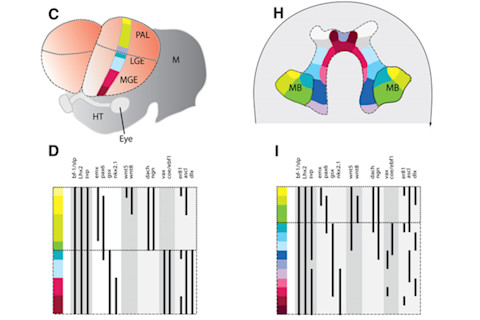 The cortex now turns out to follow the same story as the eye. Detlev Arendt of the European Molecular Biology Laboratory and his colleagues decided to compare the genes that build the cortex in mammals to the genes that build mushroom bodies in invertebrates. They studied a pretty little creature called the ragworm. They chose it because it has huge, easy-to-study mushroom bodies, and because it has evolved more slowly since the vertebrate-invertebrate split than flies and other well-studied species. The scientists carried out an exquisitely detailed survey, mapping where a number of genes were becoming active in the developing ragworm brain, down to the individual cell. The figure here shows a remarkable similarity. On the left is a developing mouse cortex. Below it is a chart showing where a group of genes are expressed. The colored strip on the brain matches the vertical axis of the chart. And to the right is a diagram of the developing ragworm brain. If you duplicate the strip in the mouse cortex and join two ends together into a fork, you get a region in which many of the same genes are being expressed in a nearly identical pattern. And that forked regions--da dum!--eventually becomes the mushroom bodies.