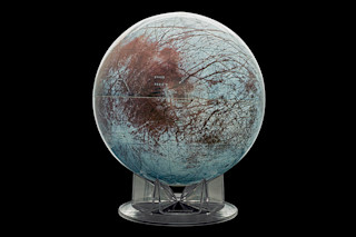 The custom-produced 12" injection-molded desktop globe features images of Europa from the Galileo Solid-State Imaging instrument, Voyager 1 and Voyager 2. There are 110 identified and labeled features, only one seam and a clear acrylic base. The realistic color view of the moon was assembled using images taken by NASA's Galileo spacecraft in the 1990s. You can buy the Europa globe for $99.95 at MyScienceShop.com.