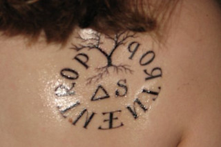 "My first year of college, I wanted to be an English major, and I took Intro Chemistry to fill the science requirement. The brief unit on thermodynamics made me fall totally in love. Entropy made sense to me - scientifically, philosophically. I became a Chemistry major and love every second of it. I got the tattoo to mark my rite of passage - Entropy going both ways, with its symble delta-S in the middle, all supported in the roots of Yggdrasil, the world-tree of Norse mythology (harking back to my English-lit days)."