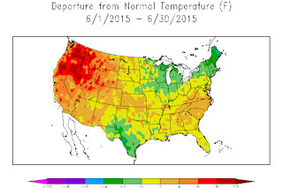 Record to near-record warmth prevailed in June from the Rockies to the West Coast, and 16 states in the East were much warmer than average. Nationally, it was the second warmest June on record. (Source: National Centers for Environmental Information) I was about to write a post focusing on how the current spate of tropical cyclones in the Pacific Ocean could kick El Niño into higher gear when I saw the latest climate report for the United States. So I'll put El Niño aside for now to focus on that. The verdict from the National Centers for Environmental Information: the United States just experienced its second warmest June in a record stretching back 121 years. Only June 1933 was warmer. According to the NCEI:
