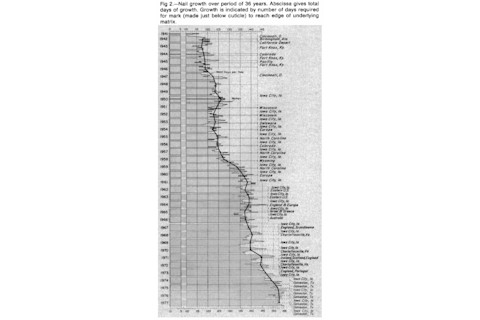 Nail growth. Thirty-five years of observation. "A 35-year observation of the growth of my nails indicates the slowing of growth with increasing age. The average daily growth of the left thumbnail, for instance, has varied from 0.123 mm a day during the first part of the study when 1 was 32 years of age to 0.095 mm a day at the age of 67."We couldn't leave you without another of our favorite passages and a figure from this fantastically written epistle! "The kind of pleasure and understanding that I get from studying natural history has long vanished from most contemporary teaching institutions that have become part of intensive care units, which are supposed to save the residual intellectual machinery of medical students. The teeming mass of hope and pain, technical virtuosity, and depersonalization called a "health center" delivers packets of what is termed "medical care." The capacity to look remains, but the capacity to see has all but vanished. Teachers and students forget that the ability to palpate is not the same as the ability to feel. As a gentle countercurrent, I set forth here this most recent five-year installment of the observations of thegrowth of my left thumbnail. It is a very long record of the growth of human deciduous tissue. Its duration has little precedent in clinical medicine or human natural history. Still, the nail provides a slowly moving keratin kymograph that measures age on the inexorable abscissa of time."