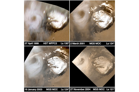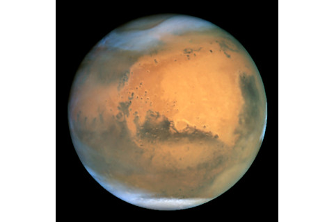 On June 26, 2001, the Earth-orbiting Hubble Space Telescope captured this image showing clouds on Mars. But with those clouds, does it snow on Mars? Another spacecraft, the Phoenix lander, provided an answer. (Source: NASA/STSci) In the Hubble Space Telescope image, frosty, bluish-white water-ice clouds are clearly visible, particularly in the polar regions.