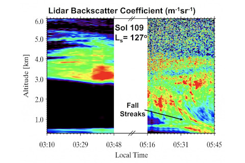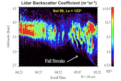 Image courtesy Jim Whiteway Once again, the similarity is uncanny. Mind you, the virga I photographed were not falling from a cirrus cloud per se. But even so, the phenomenon at its most fundamental level is basically the same. "From the viewpoint of a lidar, the atmosphere of Mars was similar in many ways to the Earth’s atmosphere — the dust as well as the clouds," Whiteway told me in an email message. The clouds his team's instrument detected were forming at about the same temperatures in which cirrus clouds form here. "So it’s not surprising that the lidar measurements of clouds on Mars look similar to lidar measurements of cirrus clouds on Earth." And not just in lidar measurements. Check out this time-lapse video showing clouds scudding along the Martian horizon, as seen by a camera on the Phoenix spacecraft: https://youtu.be/JAT-2Kv_ig0 Watch the circled cloud carefully and you may be able to see faint wisps of ice crystals precipitating toward the surface. (This video is a short snippet from the full 2012 presentation by Jim Whiteway I mentioned earlier. For a more detailed look at the science, make sure to check out the presentation here: https://bit.ly/2Ss9Zy7 ) So, we've got virga on Mars. And in lidar measurements and even photographic imagery, they look just as they do here on Earth. But that still begs the question: Do the ice crystals in Martian virga ever reach all the way down to the ground? In other words, does it snow on Mars? This lidar imagery answers that question: