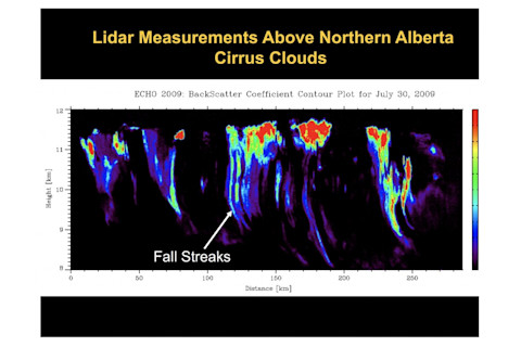 An instrument aboard the Phoenix spacecraft recorded evidence of "fall streaks" — hook-shaped virga — on Mars. (Image courtesy Jim Whiteway, Centre for Research in Earth and Space Science York University, Toronto) In this image, you're looking at something akin to a cross section of a cloud between about three and four kilometers up in the atmosphere. "The lidar showed the outline of the cloud and its internal structure as it drifted by," Whiteway says. The features labeled "fall streaks" are a form of virga — in this case, ice crystals forming at about 4 kilometers up and dropping down to about 2.5 kilometers. "It took three or four hours to drop," Whiteway says. The very tiny particles were very similar in size to ice particles associated with cirrus clouds on Earth. Now, scroll back up to the beginning of this post and compare the features in my iPhone photo of the virga near Boulder to this lidar image. The similarity is pretty obvious. Here's what fall streaks look like on Earth as measured by lidar: