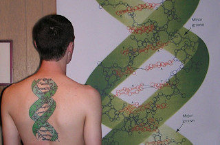 "Hey there Carl,"My tattoo is from an Irving Geis illustration of DNA. I was attracted to his attention to the molecular detail while also drawing in a representational spiral that doesn't ignore the basic beauty of the double helix.