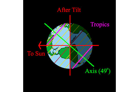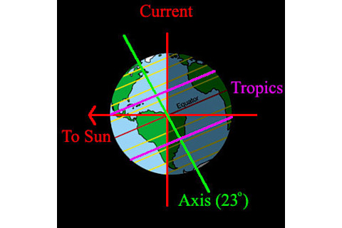 I have received several emails about a website claiming that the Earth is tilting wildly from its usual 23.5º inclination, and that this is causing global catastrophe that has been covered up by the government. Of course. The website is called Divulgence.net. It goes on for page after page with breathless warnings of Doom and Coverups. From what I have read, it appears the author is claiming that solar activity has caused the polar ice to melt, tilting the Earth an additional 26 degrees, moving the positions of sunrise, changing weather patterns, and so on.