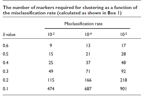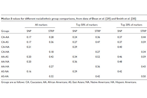 ...we can estimate that about 120 unselected SNPs or 20 highly selected SNPs can distinguish group CA from NA, AA from AS and AA from NA. A few hundred random SNPs are required to separate CA from AA, CA from AS and AS from NA, or about 40 highly selected loci. STRP loci are more powerful and have higher effective δ values because they have multiple alleles. Table 3 reveals that fewer than 100 random STRPs, or about 30 highly selected loci, can distinguish the major racial groups. As expected, differentiating Caucasians and Hispanic Americans, who are admixed but mostly of Caucasian ancestry, is more difficult and requires a few hundred random STRPs or about 50 highly selected loci. These results also indicate that many hundreds of markers or more would be required to accurately differentiate more closely related groups, for example populations within the same racial category.