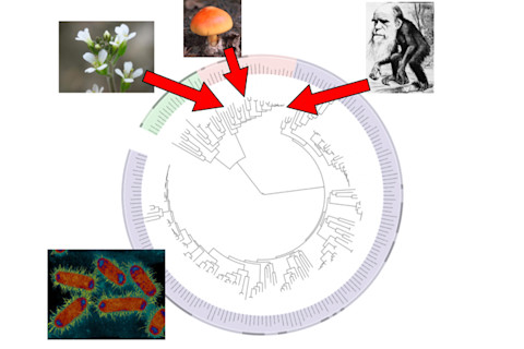 I am hanging out at the airport, having just missed my flight to Raleigh, but free wireless makes it just an extra office. I've just read a few complaints on my post about visualizing the tree of life. Some commenters are not pleased that the tree I illustrated the post with does a grave disservice to the overwhelming diversity of the bacterial world. It is certainly true that bacteria (and archaea) are staggeringly diverse. In a spoonful of soil there may be 10,000 species of microbes. By comparison, there are only about 5,000 mammal species. A lot of the diversity in microbes is ancient, since they've been around a lot longer than mammals, or even animals. That being said, it's important to bear in mind that there is no tree that includes all 1.8 million known species on the tree of life. Or even one percent of the branches. The biggest tree out there that I know of has 13,533 branches, and it's just a tree showing how plants are related to each other. It's likely that there are five or ten times more species waiting to be discovered. The mostly unknown diversity of microbes may kick that figure even higher. So the best we have to settle for right now are stick figure drawings. The illustration I used was produced a few years ago by David Hillis at the University of Texas and his colleagues. Of all the evolutionary trees that include branches from all the major groups of living things, Hillis's has the most species. (If there's a bigger one out there, just let me know.) There indeed a lot of animals, plants, and fungi on his tree, but until recently, they dominated the genetic databases that researchers use to build such trees. That's changing fast now, fortunately. For those who want things put in better perspective, the best I can offer you is a modified version of a tree I'll be showing tomorrow at my Darwin Day talk. The original tree comes from the interactive Tree of Life site. It's based on all the species whose genomes have been fully sequenced. The iTOL scientists analyze a select group of genes that show little sign of having been swapped between species. Here, all the eukaryotes (us, fungi, plants, protozoans) are in the red section of the outer circle. The blue are bacteria, the green archaea (a separate branch of microbes). There's some debate over the methods the scientists used to generate this tree, and the few hundred branches are pretty paltry. But it definitely conveys the deep diversity among the microbes, and the surprisingly small distance between you and a Portobello mushroom.