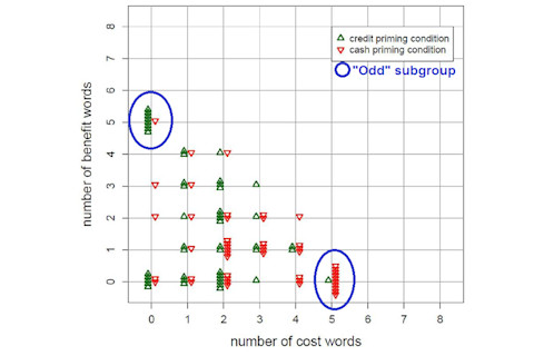 The sets of words are not identical, but most of them differ in only one or two words from the "consensus" answers within the block. Pashler et al. say that this is extremely unlikely to have happened by chance, and they raise the possibility that these 20 participants were "reduplicated" - essentially, copy-pasted. The few differences may then have been added manually, to make the data look less suspicious. Couldn't it be that people just tend to complete these stems the same way? Pashler et al. say that this is prima facie unlikely - is "SPOOK" really the obvious completion for "SPO_"? More importantly, they also show that the degree of overlap is far higher than would be expected by chance: the other 74 participants, who Pashler et al. seem to accept as real, gave much more divergent answers. What makes Pashler et al.'s point more remarkable is that these 20 participants were not selected (or cherry-picked) on the basis of their similar responses to the filler items. They were selected for an entirely different reason - because they form two subgroups who showed a dramatic response to the priming manipulation. Priming response in the word completion task was defined by the number of 'cost' and 'benefit' word stems completed in a particular way. There were 8 of each of these kinds of stems. If we plot the number of 'cost' and 'benefit' completions per participant, we get a scatter plot. Two outlying subgroups are apparent: these groups show a strong priming effect in the expected direction (e.g. they are evidence that money priming works.)