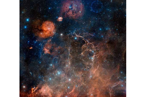 This small thumbnail I have posted here cannot possibly do justice to the magnificence of the original image. It's by Davide De Martin, whose images have graced this blog before. He has a pan and scan version online, and you simply will not believe the utter beauty and detail of the image. The image is of the Vela supernova remnant, the expanding gas from a supernova many thousands of years ago. The gas is chewing its way through the thick gas and dust surrounding it, creating that beautiful filamentary pattern. I'm a little ticked at myself; Davide emailed me about this a few days ago, but I was too busy to look, and now those guys at APOD already posted it. I could have scooped them! Curses! The second image, from Hubble, will no doubt make APOD in a day or two as well: