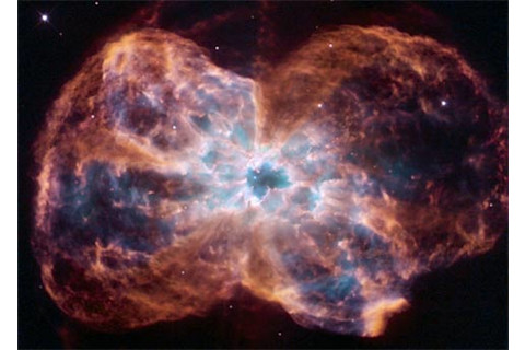 That's NGC 2440, another planetary nebula (like the Helix, which I posted about yesterday). I worked on an early Hubble image (this one) of this nebula; it boasts the hottest star known. The white dwarf in the heart of NGC 2440 is at 200,000 Kelvin, which is pretty frakkin' hot. The Sun is at about 6000 Kelvin, for comparison. Yikes. Sally Heap, who took the image with Hubble, wanted me to see if I could extract some good measurements of the star from the data, but the images were taken before Hubble's eyesight was corrected, and the blurriness made it impossible to do much better than what had been done previously. Not too much later, my friend Howard Bond took another image of the nebula, which was much nicer and easier to measure. That was an impressive image, but this new one is phenomenal. The details are sharper, and the field much wider. At first I thought the image was mislabeled; it didn't look at all like the nebula I knew! But in a second look I could see that the image I was used to is just the inner portion of this much bigger one. Science marches on! I'm glad it does. We learn more, and get prettier pictures.
