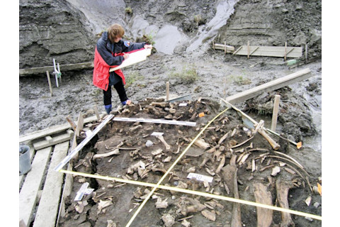 Alla Mashezerskaya maps the Yana dig site where two 31,600 year-old milk teeth were found. The teeth were used to obtain genetic information for the study. (Credit: Elena Pavlova)