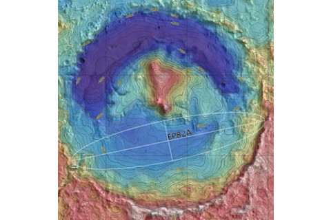 [Click to engrandcanyonate.] What you're seeing here is a topographical model of a small part of a crater floor on Mars: Gale Crater, to be precise, a monster 150 km (90 miles) wide impact located nearly on the equator of Mars. In its center rises a mountain, a central peak common in large impact craters. Surrounding this central peak is an enormous mound of material, rising kilometers above the crater's floor (see the topographic image below; the ellipse represents an old potential landing site of the Spirit rover). It's not entirely clear how this mound formed; however, it's likely that the entire crater was once filled with material laid down as periodic deposits, and that most of it has eroded away, leaving just that lopsided mound.